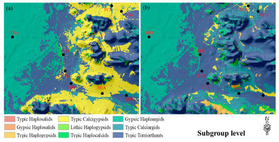 - Jafari, A.; Finke, P.A.; Van de Wauw, J.; Ayoubi, S.; Khademi, H. Spatial prediction of USDA-great soil groups in the arid Zarand region, Iran: Comparing logistic regression approaches to predict diagnostic horizons and soil types. Eur. J. Soil Sci. 2012, 63, 284–298. [Google Scholar] [CrossRef]