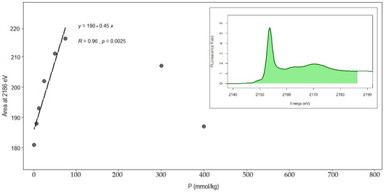 The analysis of standard mixtures by XANES spectroscopy is a very common approach when testing the suitability of a fitting method [18,26]. We started our analysis by testing the correlation of total P content with the area of the XANES spectra from 2137 to 2186 eV, prior to normalization in an approach similar to [35,36]. Our results show a high correlation (R = 0.96; R2 = 0.9188, Figure 1) of the total area with that of the total P concentration up to 75 mmol kg−1 of P. Above that concentration, the damping because of self-absorption breaks the correlation between the signal and the P concentration of the sample. This effect indicates that, in our samples, above 75 mmol kg−1 of P self-absorption occurs in such a manner that the total area of the P K-edge spectrum of the given sample does not reflect anymore the P concentration of that sample.