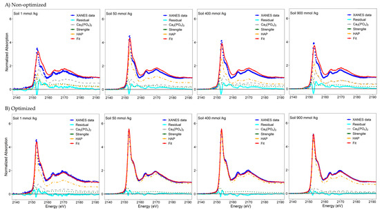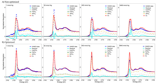 Combining our results, we have determined that the range which allows accurate LC fitting results is from 1 to 300 mmol kg−1 P. Although self-absorption occurs within the determined range, with our data optimization protocol we can reach accurate results with variation across different concentrations. At this range, the data optimization protocol yields results with less than 10% deviation from the expected result (Figure 4A). Furthermore, although in the soil sample the results have similar variance across the different concentrations. The R-factor was constantly lower in the optimized results (Table 2), when using the same standards, which indicates at the most a mathematically better answer.