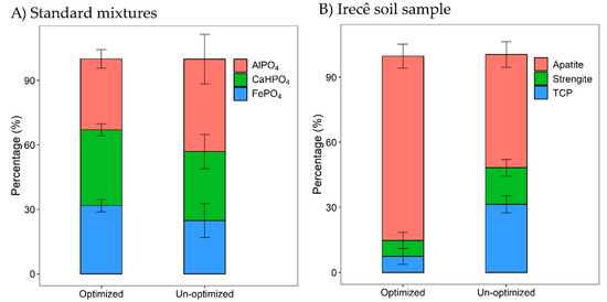 Comparison between the LC fit results across the concentrations between 1 to 300 mmol kg−1 P on the (A) standard mixtures and on the (B) Irecê soil sample. The selected range includes both a region where self-absorption is neglectable (1 to 75 mmol kg−1 P) and above the optimum concentration. Note that the results given by the optimized LC fitting are less variable across the different concentrations.