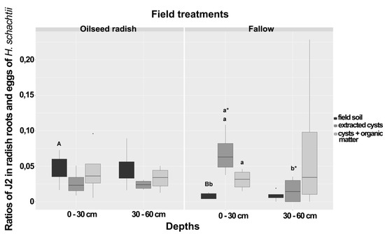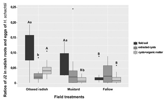 | Ratio of J2/eggs in radish bioassay | 0.04 A | 0.04 | 0.007 B | 0.007 | |