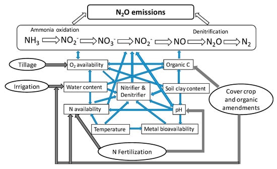 Soil management practices and factors affecting N2O emissions from soils. Blue arrows represent the relationships between soil factors and N2O production pathways. Black arrows represent the relationships between soil management practices and soil factors that can be directly changed by these practices.