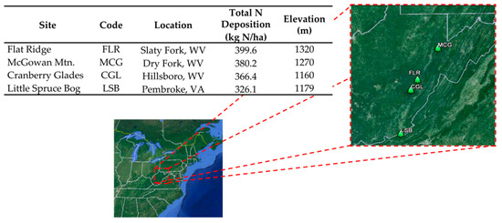 Four high-elevation red spruce stands were selected based upon site characteristics including elevation, tree species composition, and position along a gradient of historic acid deposition in central Appalachia (Figure 1). All sites are at high elevation (>1100 m) and have a southwest aspect with slopes from 0% to 10% within the plot area. Site selection for historic acid deposition relied upon data from the National Atmospheric Deposition Program (NADP) following the procedure of Smith et al. (2016). Sites were chosen from estimated cumulative total inorganic N wet deposition (NO3− and NH4+) from 1985 to 2012. Data for dry deposition of N (HNO3, NO3−, NH4+) were available for the years 2000–2012, and were incorporated into estimates of total inorganic N deposition by calculating the ratio of wet N deposition to total N deposition for those years and applying it to each pixel in the NADP spatial model for the mid-Atlantic region [39]. These data were then used to estimate total N deposition for the years 1985–1999 that lack available dry deposition data for the highly resolved and well-validated spatial model used by NADP. Although S deposition likely represented a significant component of historic acid deposition, historical data for S deposition were neither robust nor adequately validated for modeling, rendering reliable site estimates unavailable. Elevated levels of N and S deposition in this region are known to spatially coincide [13].