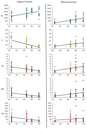 Soil pH varied significantly by fraction (O = 3.38, M = 3.50), and increased slightly in each fraction across the N deposition gradient (Supplementary Materials Figure S2). Stepwise regression analysis indicated that soil N was primarily influenced by precipitation and elevation in organic fractions and by N deposition and elevation in mineral fractions (Table 3). Other indicators of historic atmospheric deposition, S, Zn, Pb, and Al, were variably influenced by N deposition, precipitation, and elevation (Table 3). Given that N deposition is partially correlated with precipitation volume and elevation, it is not surprising that these three variables interact in various ways to explain observed soil chemical indicators of historic air pollution deposition.