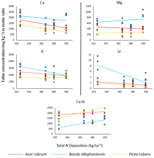 Ratios of certain elements can be informative as to source, as well as providing an indication for the presence of processes such as chemical weathering. For example, charge and ionic radius result in Ca and Sr displaying similar behaviors in the plant–soil continuum, with the Ca:Sr ratio effective for integrating soil and tree Ca status [71]. Trees preferentially uptake Ca rather than Sr due to its importance as a macronutrient, while Sr is not known to have any necessary biological function [72]. Plant discrimination of Ca over Sr allows scrutiny of plant Ca availability and source, with lower Ca:Sr ratios a potential indication of low plant-available Ca or interference by Al [73]. In the current study, organic and mineral fraction Ca:Sr ratios increased and foliar Sr declined to a greater degree than Ca as modeled estimates of N deposition increased (Figure 3), also leading to increases in the foliar Ca:Sr ratio in B. alleghaniensis and P. rubens, but not A. rubrum. It thus appears that N deposition is not/no longer limiting Ca or that the trees are extracting Ca from the mineral fraction where Ca is accumulating along the N gradient.