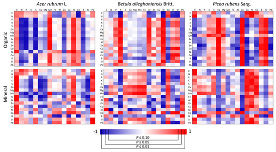 Although the tree species were sympatric at all four sites, the foliar–soil nutrient associations differed among them. Pearson product–moment correlations indicated broad differences in foliar element concentrations and their counterparts in each soil fraction (Figure 5). There were no obvious diagonal associations in the matrices in Figure 5, indicating that foliar elemental profiles were broadly independent of organic or mineral soil elemental availability. For example, while Mn concentrations in A. rubrum were positively correlated with both organic and mineral fraction Mn concentrations, Ca, Mg, and Fe were not (Figure 5). For some elements such as K, Al, and Ni in yellow birch, and Ca, Zn, and Sr in red spruce, the correlations are significantly positive in one fraction and significantly negative in the other. This latter pattern indicates that the tree species at these sites preferentially uptake selected elements from different depths of the soil profile.