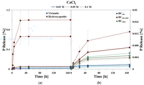 P release kinetics of (a) hydroxyapatite and vivianite as well as (b) bone char using CaCl2 at pH 6.