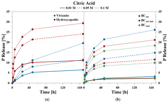 P release kinetics of (a) hydroxyapatite and vivianite, as well as (b) bone char using citric acid (CA) at pH 6.