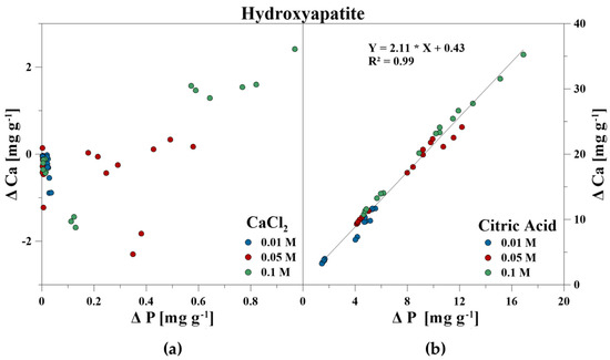 Correlation between dissolved P and Ca during P release using (a) CaCl2 and (b) CA from hydroxyapatite.