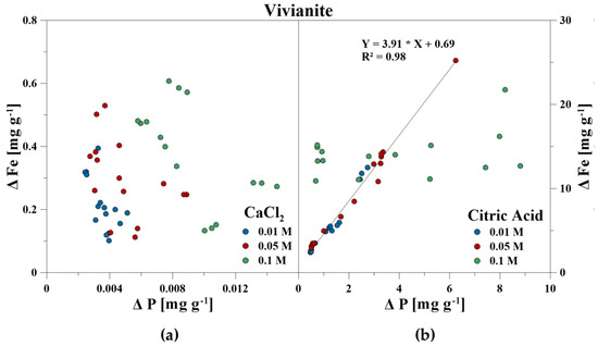 Correlation between dissolved P and Fe during P release using (a) CaCl2 and (b) CA from vivianite.