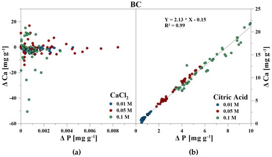 The elemental composition of the reaction solutions and its change in concentration was measured and correlated to the amount of released P in mg g−1 for each time step. For the CaCl2 treatment, no correlations between P–Ca (HA), P–Ca, and P–Fe (VI), and P–K, P–Cl as well as P–Ca (BC) were detected. This also included P–Mg (BC) for the CA treatment. However, a strong linear correlation was revealed for P–Ca at the CA treatment for HA and BC as well as P–Fe for VI (Figure 3, Figure 4 and Figure 5). With increasing P release for both CaCl2 and CA, an enrichment of Ca (HA, BC), Fe (VI), and Mg (BC) in the reaction solution was measurable. However, the Fe concentration in CA for VI remained constant at the highest concentration of 0.1 M and no correlation was found. For BC, the concentration of dissolved Mg initially increased in the CaCl2 solution, but decreased during P release (Figure 6).