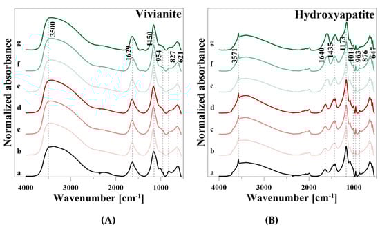 Fourier-transform infrared spectra of (A) vivianite and (B) hydroxyapatite during P release. (a) reference (b) 0.01 M CaCl2, (c) 0.05 M CaCl2, (d) 0.1 M CaCl2, (e) 0.01 M CA, (f) 0.05 M CA, and (g) 0.1 M CA.