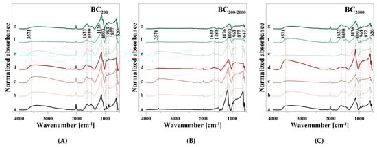During P release using CaCl2, the intensities of the OH and H2O bands between 3737 and 2585 cm−1 fluctuated and increased with increasing particle size at the highest concentration of 0.1 M (Figure 8A–C). The other H2O, OH, CO32−, and PO43− bands also showed an irregular behavior with regard to the used solution concentrations during P release. Merely a new H2O band at 1633 cm−1 was formed in BC200–2000, and the intensity of the P bands increased with increasing particle size and even exceeded the baseline level. When CA was used, a degradation of the H2O, OH, CO32−, and PO43− bands occurred. Again, an additional vibration at 1633 cm−1 was formed, which differed from the H2O band in the broader slope at a higher wavenumber.