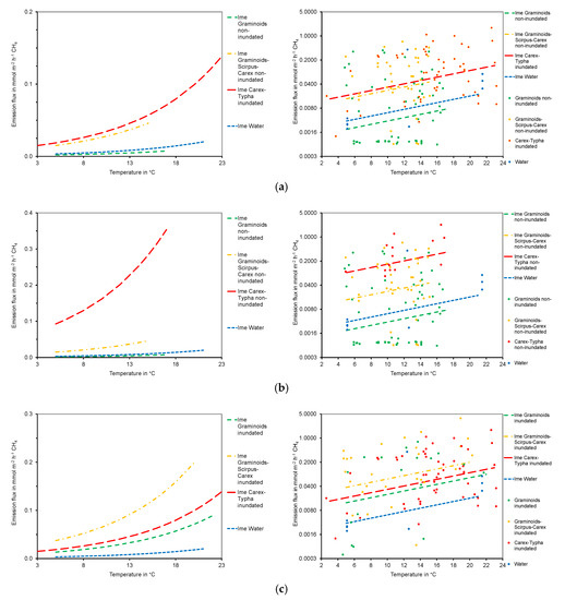 Flux of CH4 (mmol m−2 h−1) related to soil or water temperature (°C) under: (a) ‘Normal’ conditions: Graminoids, Graminoids-Scirpus spp.-Carex spp. in non-inundated conditions and Carex spp.-Typha latifolia in inundated conditions (around 30 cm water depth); (b) ‘Dry’ conditions: all plant communities are situated above water level; (c) ‘Inundated’ conditions: all plant communities are situated below water level. Lines (left and right): Fluxes estimated with the linear mixed effects (lme) model (cf. Table 3) based on measured temperature ranges; dots (right): fluxes estimated according to Equation (1). Note the log-scaled y-axes in the figures on the right.