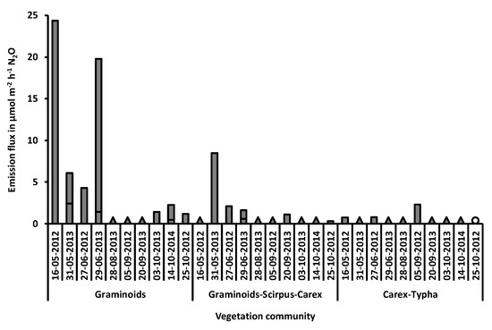 However, detectable N2O fluxes were only found in vegetation communities containing Graminoids or Carex (Figure 4). Fluxes above 2.6 µmol m−2 h−1 were only found in the vegetation communities Graminoids and Graminoids-Scirpus-Carex, thus in the typically non-inundated higher shore zone. Those tendencies are in line with the general understanding of N2O emergence in soils, where soil moisture is a major driver of N2O emissions [33,94].
