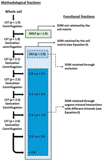 where ρom is the density of soil organic matter (i.e., 1.6 according to Chenu and Plante [53]). Our procedure yielded nine estimated values of ρcpx for each mineral, resulting in a mean ρ value (and standard deviation) for each mineral (Table A1 and Table A2). We chose 1.9 as the initial density threshold after Gregorich et al. [30] and Basile-Doelsch et al. [16]. From the ρcpx estimates, we set five density thresholds for the sequential fractionation, that is, ρ = 1.9, 2.1, 2.3, 2.5, and 2.6 (Figure A1).
