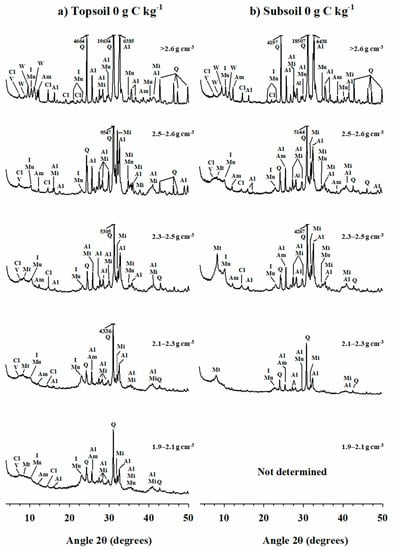 Residue addition did not influence the diffractograms of soil density fractions, so those of unamended soils are presented as an example (Figure 2). The soil matrix was dominated by primary minerals (quartz, albite, microcline, and muscovite), but secondary minerals (montmorillonite, chlorite, vermiculite, and illite) were observed in most density fractions. In topsoil (Figure 2a), the diffractograms of the fractions 1.9–2.1, 2.1–2.3, and 2.3–2.5 were similar; they showed broad peaks and diffusion bands at low angle, and small peaks of chlorite/vermiculite (at 7.3°), montmorillonite (at 8.4°) and illite/muscovite (at 10.3°). The intensity of chlorite (at 14.5°) and illite/muscovite (at 10.3°) peaks increased in the denser soil fractions, whereas the opposite was observed for montmorillonite (at 8.4°). The subsoil (Figure 2b) had a montmorillonite (at 8.4°) peak in the 2.3–2.5 fraction. Montmorillonite was also observed in lighter (<2.3) and heavier (>2.5) fractions. Larger peaks of montmorillonite (at 8.4°) and illite/muscovite (at 10.3°) were seen in the 2.1–2.3 and 2.3–2.5 fractions of subsoil than topsoil. In the 2.5–2.6 fraction, the diffusion band at low angle was clearly visible in subsoil and the intensity of the peaks of chlorite/vermiculite (at 7.3°), montmorillonite (at 8.4°) and illite/muscovite (at 10.3°) were greater in subsoil than in topsoil.