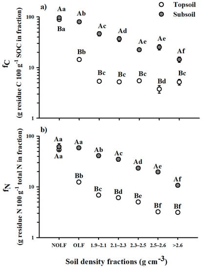 Fraction of (a) soil organic C (SOC) coming from residue C (fC, Equation (4)) and (b) total soil N coming from residue N (fN, Equation (4)) within density fractions in topsoil (0–20 cm) and subsoil (30–70 cm) after 51 d of incubation with 10 g C kg−1 of 13C-15N-labelled corn residues. Different uppercase letters indicate a significant difference between topsoil and subsoil within density fractions, and different lowercase letters indicate a significant difference between density fractions within soil according to Fisher’s least significant difference (LSD) test.