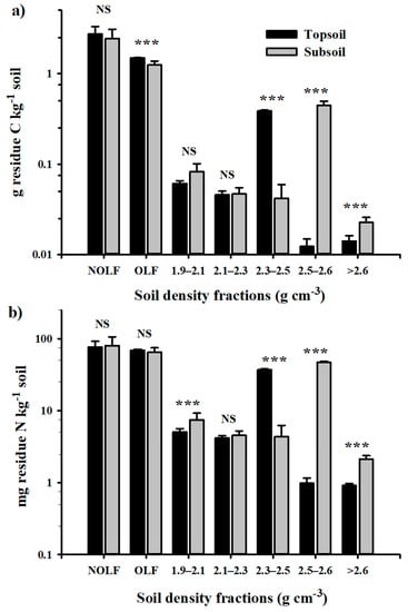 Concentrations of (a) residue C and (b) residue N in density fractions in topsoil (0–20 cm) and subsoil (30–70 cm) (Equation (5)) after 51 d of incubation with 10 g C kg−1 of 13C-15N-labelled corn residues. Error bars are standard deviation of the mean. NOFL, non-occluded light fraction (ρ < 1.9); OFL, occluded light fraction (ρ < 1.9). Within soil density fractions, NS indicates no significant difference and *, **, and *** indicate significant difference between topsoil and subsoil at p < 0.05, 0.01, and 0.001, respectively (LSD test). The y-axis is on a logarithmic scale.