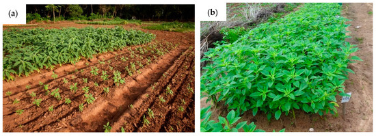 The study sites were located in (a) Ina, Republic of Benin (9° 95 N, 2°72 E), which has an elevation of 380 m, an annual precipitation of 1073 mm, and a mean temperature of 26.5 °C, and (b) Ilesha, Nigeria (07°29′21.9″ N 004°34′17.3″ E), which has an altitude of 372 m, an annual precipitation of 1386 mm, and a mean temperature of 25.5 °C. Ina is in the dry savanna ecoregion, whereas Ilesha falls within the rainforest ecoregion. Plots from both sites were cultivated with two indigenous vegetable species shown in Figure 1: local amaranth (Amaranthus cruentus) and African eggplant (Solanum macrocarpon).