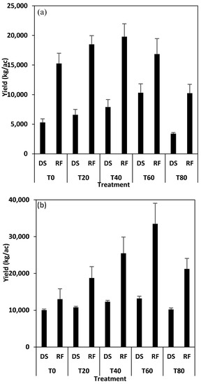 The RF had higher vegetable yields than the DS for both vegetable species (Figure 2a,b). For the AC, the T40 had the highest yield in the RF, while the T60 gave the highest yield in the DS (Figure 2a). For the SM, the T60 gave the highest yield in both ecoregions (Figure 2b). However, for economic profitability, the T40 was considered the recommended rate.