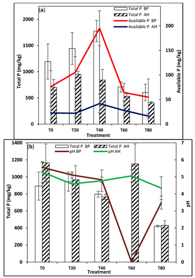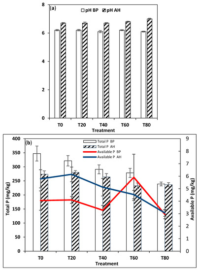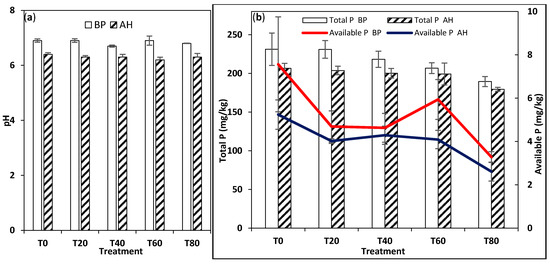 Effects of fertilizer treatments on (a) pH and (b) total P and available P measured before planting (BP) and after harvest (AH) of Amaranthus cruentus cultivated on dry savanna soils.