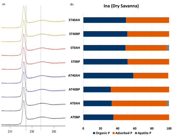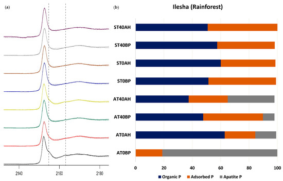 Furthermore, in the rainforest soils cultivated with SM, the LCF showed adsorbed P and organic P as the dominant P forms in ST0 before planting, at 51.4% and 47.6%, respectively (Table 3, Figure 7a,b). After harvest (ST0AH), there were changes in the P speciation as organic P increased to 60.1%, while adsorbed P decreased to 38.5% (Table 3, Figure 7a,b). In ST40 treated soils, organic P accounted for 57.6% of the P present in the soil prior to planting while adsorbed P accounted for 40.5%. After harvest, organic P reduced slightly to 50.9% while adsorbed P increased, accounting for 49.1% of the P species present (Figure 7a,b).