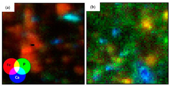 Further investigation into the RF samples AT0Bp and AT40Ah on a microprobe showed that the AT0Bp samples had concentrated discrete particles that contained high levels of both Ca and P (turquoise “hotspots” in Figure 8a), which was consistent with the high apatite content observed by LCF analysis of the bulk XANES for this sample. In contrast, the AT40Ah image showed P that was both correlated with Fe (yellow regions in Figure 8b) and spread diffusely throughout the entire sample. This was what would be expected based on the LCF model that described the sample with P adsorbed on iron oxides and P of organic origin.