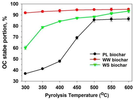 The stable proportion of organic carbon (OC) in biochars derived from waste wood (WW), wheat straw (WS), and poultry litter (PL) through complete slow pyrolysis at 300–600 °C peak temperatures. Error bars represent standard deviation of triplicate measurements. The stable OC content was measured in <0.15 mm sample replicates using the dichromate oxidation methods [10].