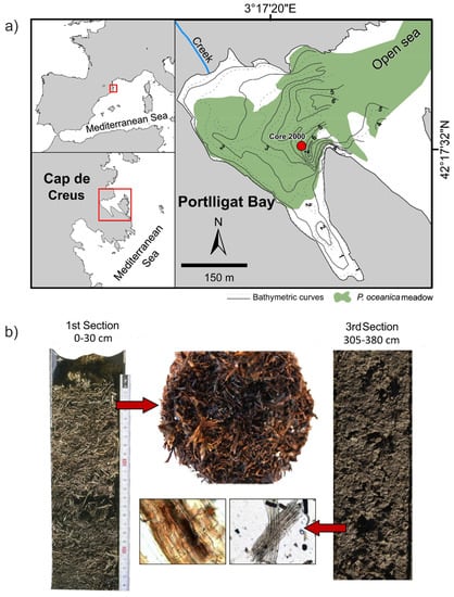 - López-Sáez, J.A.; López-Merino, L.; Mateo, M.Á.; Serrano, Ó.; Pérez-Díaz, S.; Serrano, L. Palaeoecological potential of the marine organic deposits of Posidonia oceanica: A case study in the NE Iberian Peninsula. Palaeogeogr. Palaeoclimatol. Palaeoecol. 2009, 271, 215–224. [Google Scholar] [CrossRef]