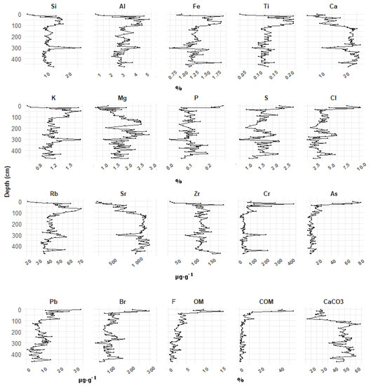- Rothwell, R.G.; Croudace, I.W. Twenty years of XRF core scanning marine sediments: What do geochemical proxies tell us? In Micro-XRF Studies of Sediment Cores: Applications of a Non-Destructive Tool for the Environmental Sciences; Springer: Berlin/Heidelberg, Germany, 2015; pp. 25–102. [Google Scholar]