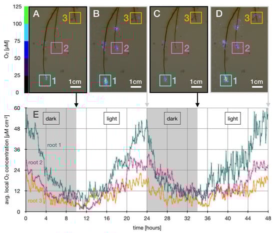Figure 2. Diurnal changes in local O2 concentrations at root tips. (AD) illustrate three root tips and local O2 concentrations in the range of 0–125 µM O2 represented as color coded pixels. Colored squares 1–3 represent areas around root tips (1.0 cm2) where local O2 concentrations were quantified at the end of dark (10 h) and light (14 h) incubated cycles, respectively. (E) displays averaged measured local O2 concentrations over time, measured in time intervals of 5 min for each root tip area 1–3, respectively.