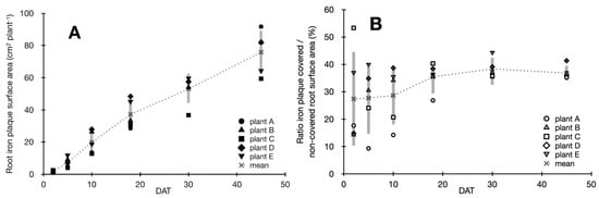 Figure 3. Root iron plaque formation during plant growth. (A) Iron plaque mineral surface (cm2 per plant) on roots during plant growth (DAT = days after transfer) of five replicate plants (filled symbols), mean root iron plaque surface area (cross & punctuated line) and standard deviation (grey bars); (B) Ratios of iron plaque-covered to non-covered root surface area (%) in rhizotrons during plant growth over 45 DAT, averaged ratio of all replicates (cross and punctuated line) and standard deviation (grey bars).