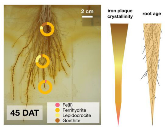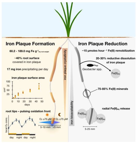Iron is an essential trace element for photosynthesis [3,4]. However, high concentrations of phytoavailable Fe(II) ultimately lead to an intoxication of the photosystem and leaf bronzing in rice plants [5]. In order to control the uptake of Fe(II)aq, rice plants release O2 from roots by so-called radial oxygen loss (ROL) [6]. At circumneutral pH, Fe(II) gets rapidly chemically oxidized by O2 from ROL to ferric iron (Fe(III)) and precipitates as Fe(III) (oxyhydr)oxides on and around the root surface as iron plaque [7]. These Fe(III) (oxyhydr)oxides represent a highly reactive mineral fraction in the soil horizons as they not only participate in the immobilization of essential plant nutrients but impact, to a large extent, the sequestration of many other soil components such as contaminants and trace elements [6,8,9,10,11].