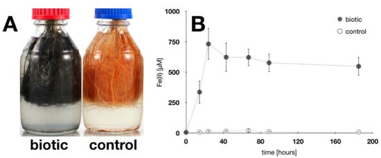 Figure 5. Root iron plaque reduction. (A): Root iron plaque exposed for 24 h to an Fe(III)-reducing enrichment culture (99.8% similarity to Geobacter spp.). Iron plaque minerals changed from orange (control) to black (biotic) during incubation. (B): Dissolved Fe(II) concentrations in medium during iron plaque reduction. Iron(III) plaque minerals were reduced and Fe(II) remobilized through microbial reductive dissolution. Error bars represent experimental standard deviation from six replicate setups.