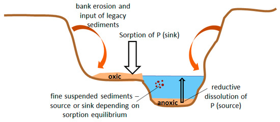 - Jarvie, H.P.; Jürgens, M.D.; Williams, R.J.; Neal, C.; Davies, J.J.L.; Barrett, C.; White, J. Role of river bed sediments as sources and sinks of phosphorus across two major eutrophic UK river basins: The Hampshire Avon and Herefordshire Wye. J. Hydrol. 2005, 304, 51–74. [Google Scholar] [CrossRef]