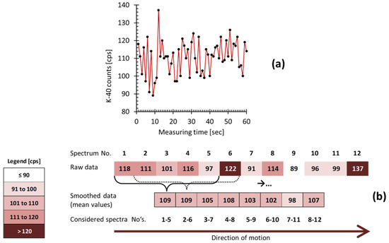 Gamma decay is not deterministic, but reveals statistical uncertainty over time [17], which is also denoted as noise. The variable decay rate as recorded when measuring at 1 Hz rate is exemplary, shown in Figure 2a. However, more sources of uncertainty have to be considered in GS. During on-the-go surveys, data collection at 1 Hz rate when driving at, e.g., 0.7 m s−1 resulted in 1.4 spectra m−1 driving distance. The footprint (in the literature also denoted as “support”) is the area from which the signal arises; it has no sharp boundary, but the relative signal contribution decreases with increasing distance between the gamma emitting source and the crystal [3]. For the chosen geometric setting, a single spectrum comes from a footprint with an approximately 2 m radius around the crystals. In consequence, the footprints of neighboured spectra overlap to a significant extent that cannot be specified. Furthermore, recording spectra on-the-go captures not only the variability in decay rates, but also gamma ray emission variability that is related to soil heterogeneity over very small distances.