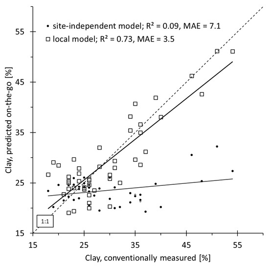 In contrast, texture prediction for the Rheinbach-1 and Ahrweiler fields failed if only the respective other field was included in the site-independent calibration (MAE > 5%). The complex composition of PPSD probably impeded a better result. First, the amounts of loess in the PPSD were different, which can be seen from the mean silt contents (Table 2). Second, the PPSD component derived from Lower Devonian sand-, silt-, and claystones revealed varying weathering degree. At Rheinbach, smectite was present, which was not the case at Ahrweiler (one X-ray diffraction (XRD) analysis per field, not shown). These differences probably impeded model transferability between the two sites that were located at only 7.5 km distance and in the same geological landscape. The failure of the site-independent model at the Ahrweiler field was obvious when measured and the predicted clay contents were plotted (Figure 3). However, the local calibration for the clay was performing sufficiently well (R2 = 0.73, MAE = 3.5% clay).