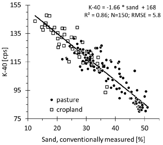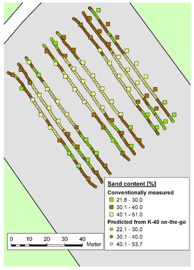 Figure 11 shows the spatial coincidence between stop-and-go K-40 counts and sand contents at the grid points at the study site Rheinbach-2. The negative correlation reflects the geopedological situation; the sand fraction is dominated by quartz grains originating from the underlying sedimentary sandstone [9,32] that is part of the PPSD. Test-set-validation with 30% of the sample set yielded reliable sand prediction (MAE = 3.1% sand). High spatial resolution of texture information allowed us to establish a dense sampling raster that captured the entire span of sand content variation as already presented in Table 1.