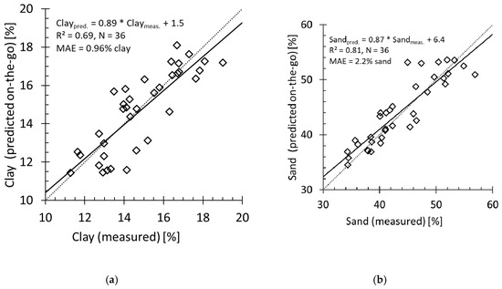 On-the-go prediction (test-set validation) for (a) clay and (b) sand contents in small experimental plots at the Düren field. The dotted lines are the 1:1 lines.