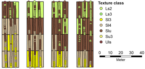 Scheme of the running plot experiment Düren. Small circles show predicted soil texture class for all data points of the on-the-go gamma survey. For prediction error, see Figure 9. The background colour in each plot shows the conventionally measured texture class in a composite sample of the respective plot.