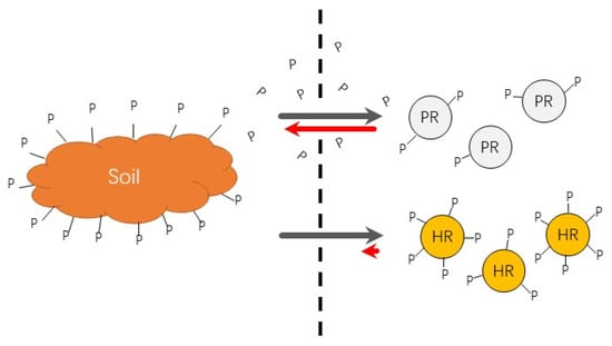 A schematic illustration of phosphate (P) desorption systems using pure resins (PR) and hybrid resins (HR) as a P sink. Forward and backward reactions are shown in black and red arrows, respectively. A vertical dotted line indicates a boundary between a mesh bag and a soil solution. Note that more P is retained in HR because of a small backward reaction (i.e., P release) from HR compared to that from PR.