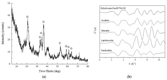 The properties of resins used in this study are shown in Table 2. Both the pure resin AMBERLITE™ HPR9200 and the hybrid resin FerrIX™A33E have polystyrene-DVB as their polymeric matrix. The structure and resin functional groups are the same. The particle size of the pure resin and the hybrid resin is ~640 and ~750 µm. XRD analysis indicates that the mineralogy of iron oxides in the hybrid resin is predominantly goethite (Figure 2a). The LC fitting of XAS reference spectra analysis also shows the same results (Figure 2b). Oscillations and spectra features are nearly identical to those of goethite (Figure 2b). Ferrihydrite was not detected in the XAS analysis.