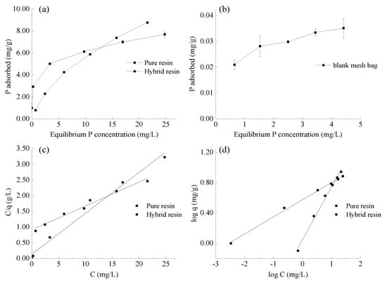 The results of the adsorption isotherm experiment show a typical L-shape curve for both resins, indicating that the adsorbates have high affinity at low surface coverage (Figure 3a). When the initial P concentration was at 10 mg/L, ~76% of P was adsorbed by the pure resin, while ~98% was adsorbed by the hybrid resin. Interestingly, the hybrid resin showed a greater affinity for P at the Ceq: 0–15 mg/L, and the pure resin had a greater affinity for P at Ceq > 15 mg/L. It is important to note that the adsorption isotherm data in Figure 3a were corrected for the residual P adsorption in mesh bags. Phosphate adsorption by a blank polyester mesh bag was <0.04 mg/g (Figure 3b). The P adsorption capacity of the hybrid resin at near-neutral pH is within the same order of magnitude with that of other adsorbents (e.g., iron oxyhydroxides, zerovalent iron, layered double hydroxides, Zr- and La-containing hydroxides) [49]. However, the hybrid resin is more suitable for the proposed mesh bag-based desorption method than the other adsorbents because its large particle size makes it easy to trap in a mesh bag and to recover or separate from soil solutions.