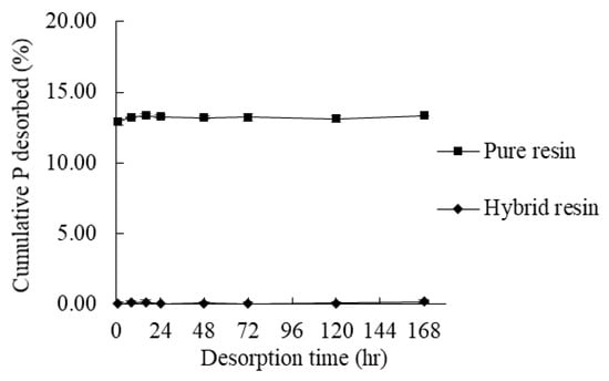 To evaluate the potential release of adsorbed P in the resins, the desorption of P from P adsorbed resins was tested. The result of the irreversibility test shows a major difference between the pure resin and the hybrid resin serving as P sinks (Figure 4). After providing the total P loading level of 2 mg/g, the resins were shaken in a P-free solution for up to seven days. The cumulative percentage of desorbed P is shown in Figure 4. Approximately, 13.3% of the adsorbed P in the pure resin was released into solution after seven days, and 12.9% of the P had already desorbed within 1 h. It is clear that the pure anions exchange resin is a good sink for the P desorption experiment. In contrast, less than 0.3% of adsorbed P was desorbed from the hybrid resin, which should be accounted for by the inner-sphere complexation of phosphate on the iron oxide coating in the hybrid resins [16,17,50]. The irreversibility test indicates that the hybrid resin had a near-negligible backward reaction (i.e., desorption). The hybrid resin is a better P sink in soil desorption studies.