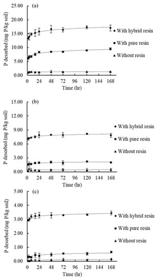 To be specific, the topsoil S_18 released 1.32 mg P/g soil without sink after seven days, which was 0.34% of its total P (Figure 5a and Table 1). In the presence of the pure anion exchange resin, the extent of P desorption increased to 9.50 mg P/g (~2.43% of TP). In the case of the hybrid resin, it was even greater. Approximately 17 mg/kg (~4.35% of TP) was desorbed after seven days. The same trend was also observed in the other two subsoils. The soil S_90 released only 0.53 mg/kg (~0.13% of TP) without any sink, but the total desorbed P increased to 7.90 mg P/g (~1.88% of TP) with the hybrid resin as a sink. The pure resin was not as effective as the hybrid resin. In the case of soil S_180, which contains the lowest TP, the efficiency in removing desorbed P was best in the hybrid resin. Only the hybrid resin was able to desorb appreciable amounts of P (~3.45 mg P/g), but no more than 0.67 mg P/g (~0.3% of TP) was desorbed with the pure resin or without any sink.