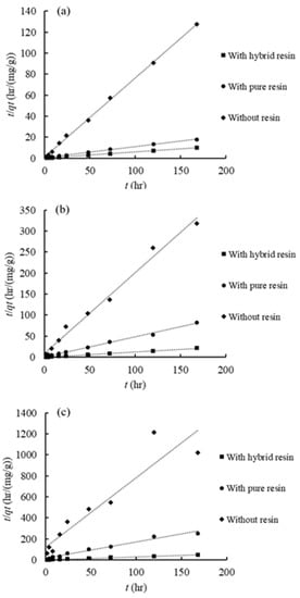 Linear plot of pseudo-second-order model for the phosphate desorption data shown in Figure 5. (a) S_18, (b) S_90, (c) S_180.