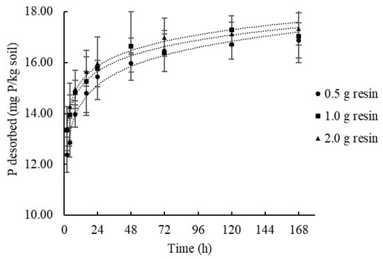 The desorption experiments were repeated in the soil S-18 using different amounts of the hybrid resin to evaluate the effects of resin mass on the kinetic rate. The results are summarized in Figure 7 and Table 5. The biphasic desorption kinetic process was observed in three systems. A fast P release was followed by a slow desorption process. The extent of total desorbed P is similar (i.e., within error bars of each data point at the same sampling time) in these soils. After 168 h, ~16.3 mg/kg of P was released in all systems.
