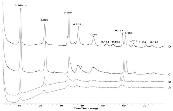 The LDHs were characterized by X–ray diffraction (XRD). The patterns of randomly oriented samples were the results of eight summed signals. The equipment (Rigaku diffractometer, Tokyo, Japan equipped with a Cu X–ray source) and its setting up (Cu Kα radiation generated at 40 kV and 30 mA and a scan speed of 2° 2θ min−1) are also described elsewhere [24]. Specific surface area of different LDH complexes was determined by assessing H2O adsorption by each sample at 20% of relative humidity, according to the Quirk method [25]. The outcomes of these characterizations are widely described in a complementary study [24]. Briefly, the authors stated that the four synthetic LDHs showed all the characteristic sharp (at 0.760, 0.380, 0.260, 0.153 and 0.150 nm) and asymmetric (at 0.231 and 0.195 nm) peaks of hydrotalcite. X–-ray diffractograms (Figure 1) of Mg-Al-LDH (C) and Zn-Al-LDH (D) showed narrow and sharp peaks indicating a well-crystalline structure, while the peaks of Mg-Fe-LDH (A) and Cu-Al-LDH (B) were broader and weaker, thus evidencing a lower degree of crystallinity and particle size [24]. As a consequence, the two poorly-crystalline LDHs showed a surface area 30% higher than that of the two more crystalline LDHs (Table 1).
