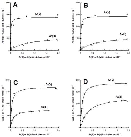 The adsorption isotherms of As(V) onto LDHs at pH = 7 are shown in Figure 2. The adsorption isotherms of As(III) on the four LDHs, described in Pigna et al. [24], are also included in Figure 2 for comparison purposes with As(V) data. The As(V) adsorbed onto the LDHs conformed to the Langmuir equation [26], reported and well-explained elsewhere [23,24].